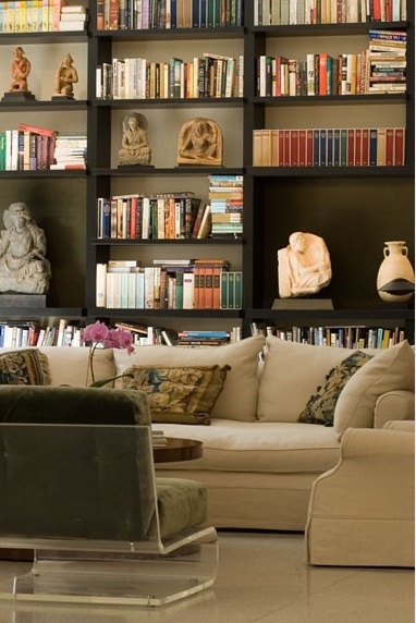 In the above two pictures they have removed some shelves to create a box for art....love this! You can also paint that box in a different color to create a little bit of drama. Don't forget the lighting!